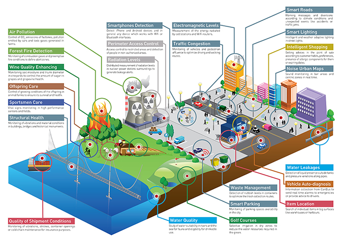 After creating the inspirational and market research, 50 Sensor Applications for a Smarter World, we have comprised that information in a beautiful info graphic comprising Smart Cities, Internet of Things (IoT) and other sensing applications like Smart parking, smart water, smart environment etc. for creating a smart world.